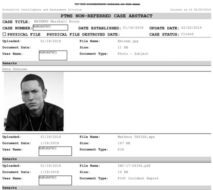According to the documents, on Dec. 15, 2017, the day Revival was released, “a concerned citizen reported Marshall Mathers the rapper ‘Eminem’ had a new song called ‘Framed’ with an inappropriate comment towards President Donald Trump and a threatening comment towards Ivanka Trump.”